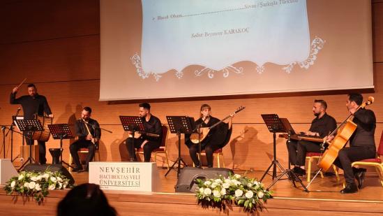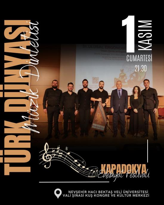 Kapadokya Edebiyat Festivali’nin ikinci gününde Nevşehir Hacı Bektaş Veli Üiversitesi Eğitim Fakültesi Müzik Eğitimi Anabilim Dalı Türk Müziği Topluluğu tarafından Türk Dünyası Müzik Dinletisi gerçekleşti. Prof. Dr. Emin Erdem KAYA, Dr. Öğretim Üyesi Özge KAYA, İsmail SÜZER, Furkan Ziya ÇETİN, Kutalmış AVAROĞULLARI, Melih AKBAL ve Beyzanur KARAKOÇ'tan oluşan topluluk Türk dünyasının birbirinden nadide eserlerini seslendirdi.