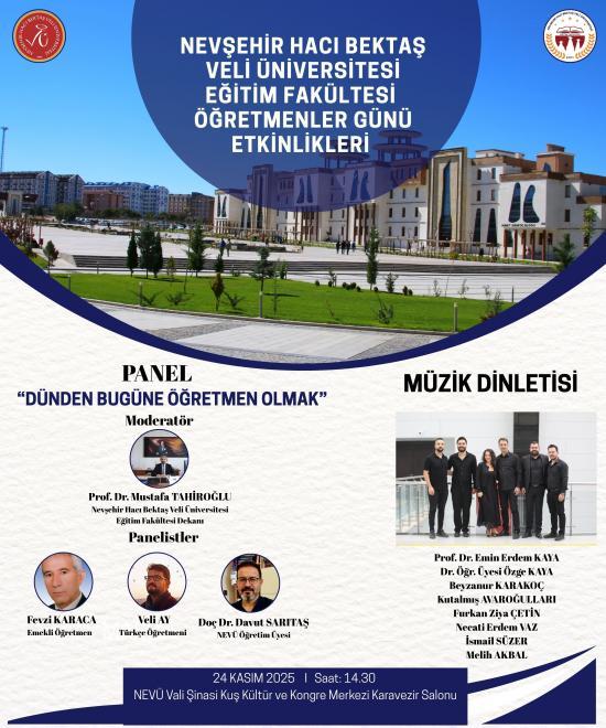 Nevşehir Hacı Bektaş Veli Üniversitesi (NEVÜ) Eğitim Fakültesi tarafından 24 Kasım Öğretmenler Günü dolayısıyla “Dünden Bugüne Öğretmen Olmak” konulu bir panel düzenlendi. NEVÜ Eğitim Fakültesi Müzik Eğitimi Anabilim Dalı Türk Müziği Topluluğu tarafından sunulan müzik dinletisinde Prof. Dr. Emin Erdem KAYA, Dr. Öğretim Üyesi Özge KAYA, İsmail SÜZER, Furkan Ziya ÇETİN, Kutalmış AVAROĞULLARI, Melih AKBAL, Necati Erdem VAZ ve Beyzanur KARAKOÇ sahne aldı. Konserin ardından açılış konuşmasını yapan Rektör Prof. Dr. Semih Aktekin, öğretmenliğin toplumsal açıdan taşıdığı kritik role dikkat çekti. Öğretmenliğin yalnızca bilgi aktarmayı değil; bir neslin değer dünyasını şekillendirmeyi, öğrencilerin potansiyelini keşfetmeyi ve onlara yaşam yolculuklarında rehberlik etmeyi içeren çok yönlü bir meslek olduğunu vurguladı.